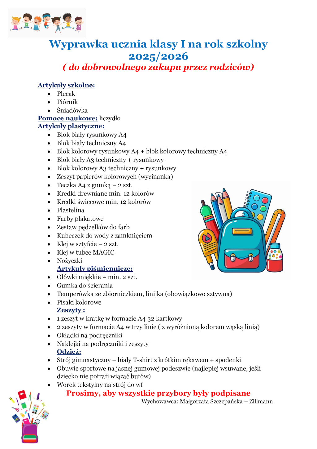 Wyprawka ucznia klasy I